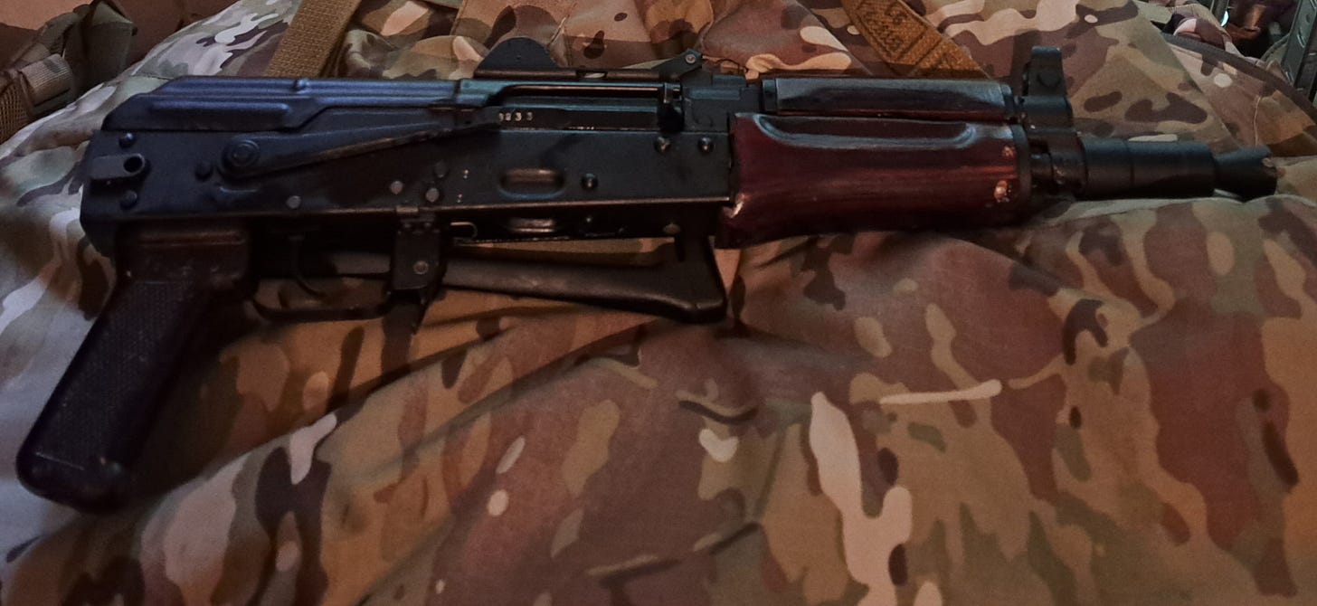 Speaking of things I've purchased recently, my rifle came with a Soviet era sling that was way too small to fit over me while wearing armor, and I'm dubious if it would've fit over my huge self without armor, so I bought a decent sling for it when we went into town to run some errands the other day. Some of you might be very interested in the weapon I was issued. Ukraine is fielding a dizzying array of weapons, from all over the world, and spanning from before World War Two, to newly manufactured arms in Ukraine, Poland, and elsewhere. I didn't know if I'd even be armed in this role, and whether if so, that'd be a pistol, submachinegun, or a rifle of some sort. Being who I am, I definitely had hopes and preferences for each. I knew Ukraine had received CZ-82 pistols from the Czech Republic, and if it were to be a pistol this was my hope. I bought one of these for Amy over a decade ago, and we both loved shooting it. It has the same trigger group as the early CZ-75's and honestly the best factory trigger of any of the well over a hundred different types of pistols I've fired. Ukraine is also fielding some submachineguns and machine pistols, and either Stechkin or a vz 48 would've been pretty cool and a good choice. I don't have any complaints about being issued a AK74U, or "Krinkov" though.