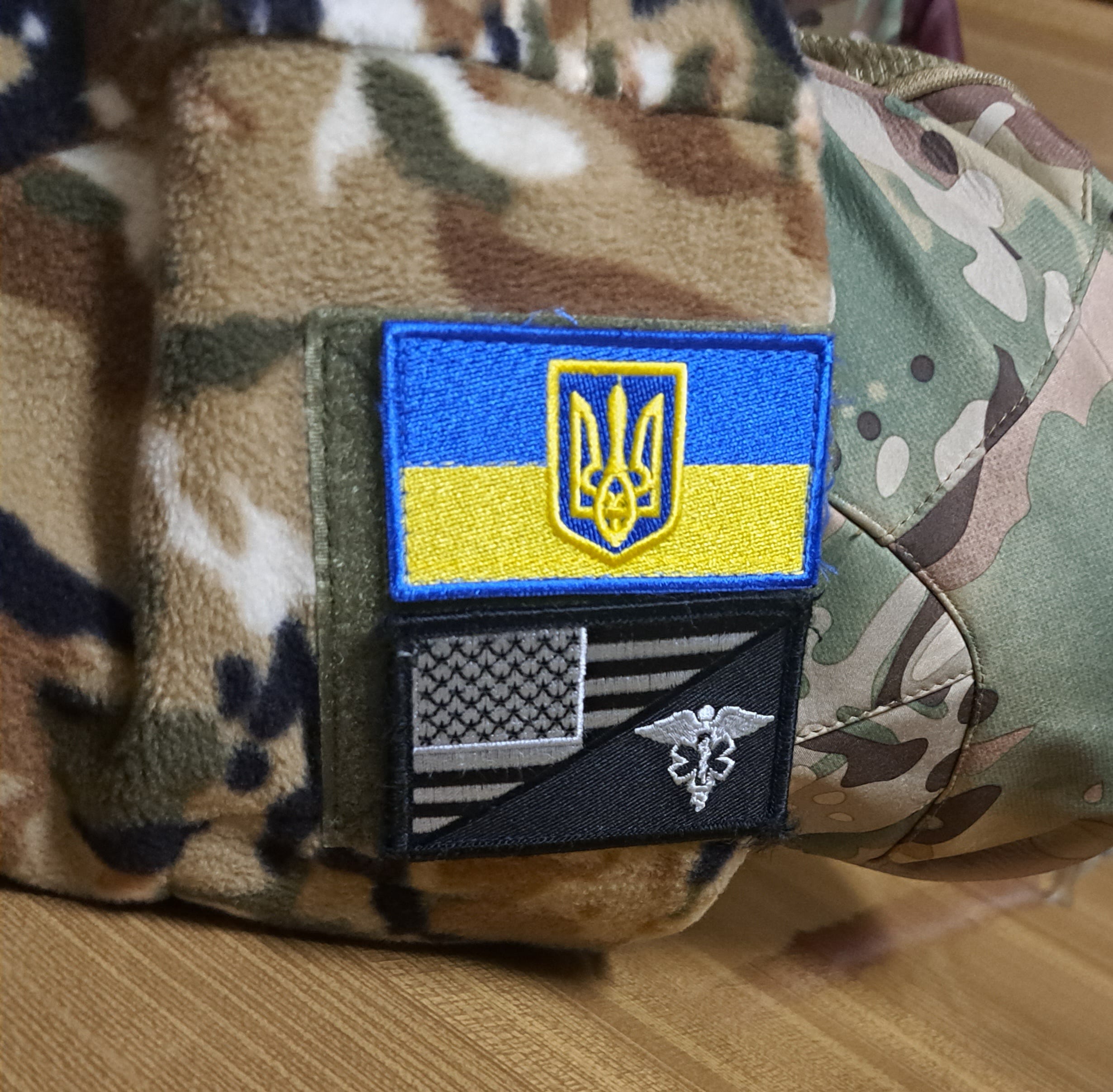Since I'm talking about my clothing and the weather, I might as well round out the rest of my attire for that day. I had a hard time finding army boots that fit, in fact I couldn't. I ended up having to go to two different outdoor supply stores to find a pair of boots big enough for my feet. They aren't huge or anything, just 12, and a little on the wide side these days. I have good socks, some of which I've purchased over here, actually at the first of the REI-like stores in Odesa that I went looking for boots in when I gave up on the military supply stores. I’ve been over here long enough to wear out some of the good pairs of socks I brought with me initially. I'm wearing Smartwool merino long john bottoms I've had for a few years, with new lined, water-resistant army pants over that. Around my neck is a thin wool gaiter I've also mostly worn while cycling in winters past, that I tend to pull up over the top of my head to cover my ears half the time. I've also got a thick camo fleece gaiter for when it really gets cold, but I don't wear it too often. I've picked up a variety of headgear, and still have two of the hats I brought to Ukraine with me. I've lost some things along the way, some I regret. Half the time I'm still wearing the green striped knit hat Amy made for me. My tiger stripe boonie hat mostly lives in the bottom of my duffel unless it is raining heavily or hot and sunny. In the field, I'm wearing a Flecktarn pattern German army winter cap. I had one of these for years in the US and loved it, but finally lost it a year or two before I came over here. It’s warm, and has ear flaps stowed across the top you can fold down. Most of the shops I go into are military outfitters, but I ducked into one that was more of a classic military surplus store, and he not only had these great hats, but in my big head size (60), so despite it not being Ukrainian army issue or one of those camouflage patterns, I bought it. It's one of the only discordant notes in my uniform.
