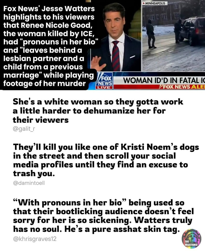 After right wingers all across the United States complained about the public reaction to white supremacist Charlie Kirk being assasinated by a fellow right winger, they immediately went online and gloated about their Gestapo executing an innocent mother and spread the disinformation that she was a ‘anti-fa terrorist’. They are gleeful about her death, after of course insisting on civility when someone from their side who advocated genocide was murdered by their own kind for not being extremist enough.