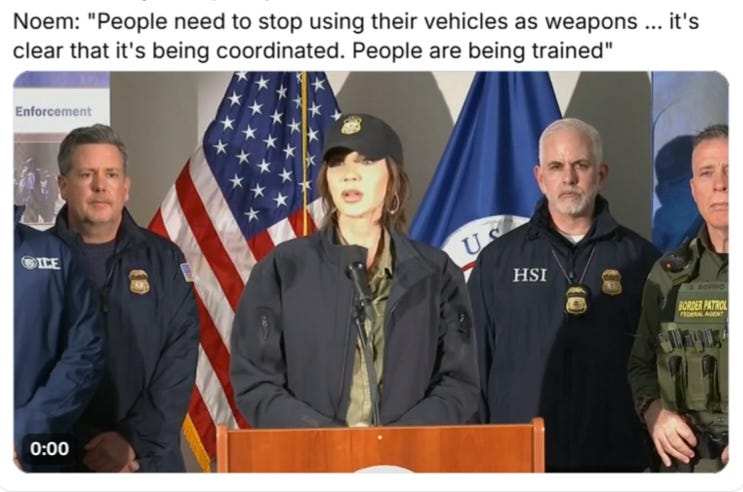 Noem did the same, stating these lies while the video of the truth played beside her and trying to explain ICE repeatedly shooting people in their vehicles as some sort of anti-fascist conspiracy, complete with a training program: