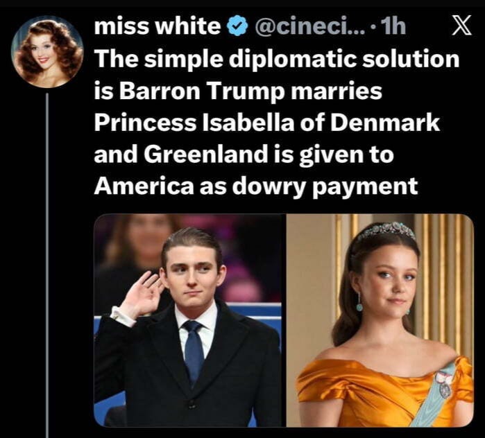 They have finally had enough and are rising up en masse. Massive crowds of people fill the streets in all their cities and are clashing with security forces. Reports are that they have taken over the second largest city in Iran. They burnt the statue of the extremist religious leader oppressing them. They are tearing down Irans’ flag and replacing it with the pre-Islamist flag. Kurdish militia groups have entered Iran and are fighting the security forces. The Iranian people have seized control of many official buildings. Although they are looking to one of the surviving monarchy for leadership, he has stated that he would like to put together a democratic government. Meanwhile, in the US the right-wing is proposing a ‘peaceful resolution’ to Trump trying to take Greenland by force via Barron marrying the princess of Denmark and Greenland being the dowry. You can’t make this shit up. Not only does Trump desire a monarchy for the USA, and act like it already is one, but right wing Americans are totally cool with it.