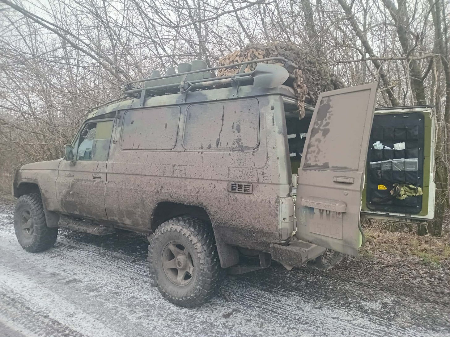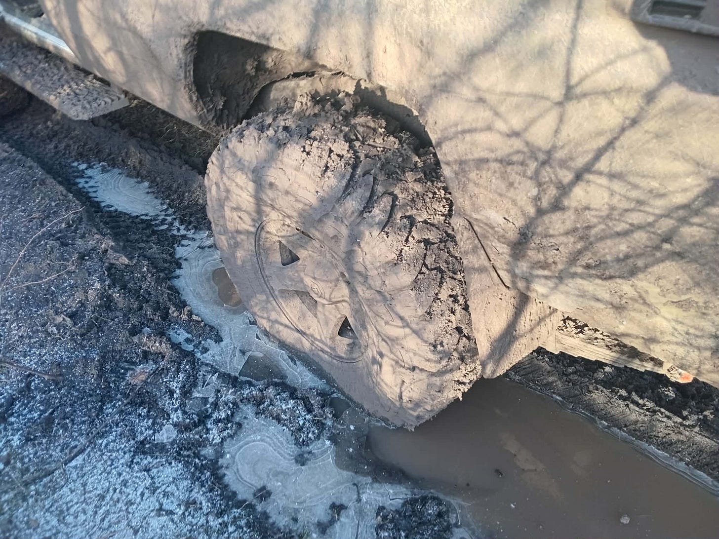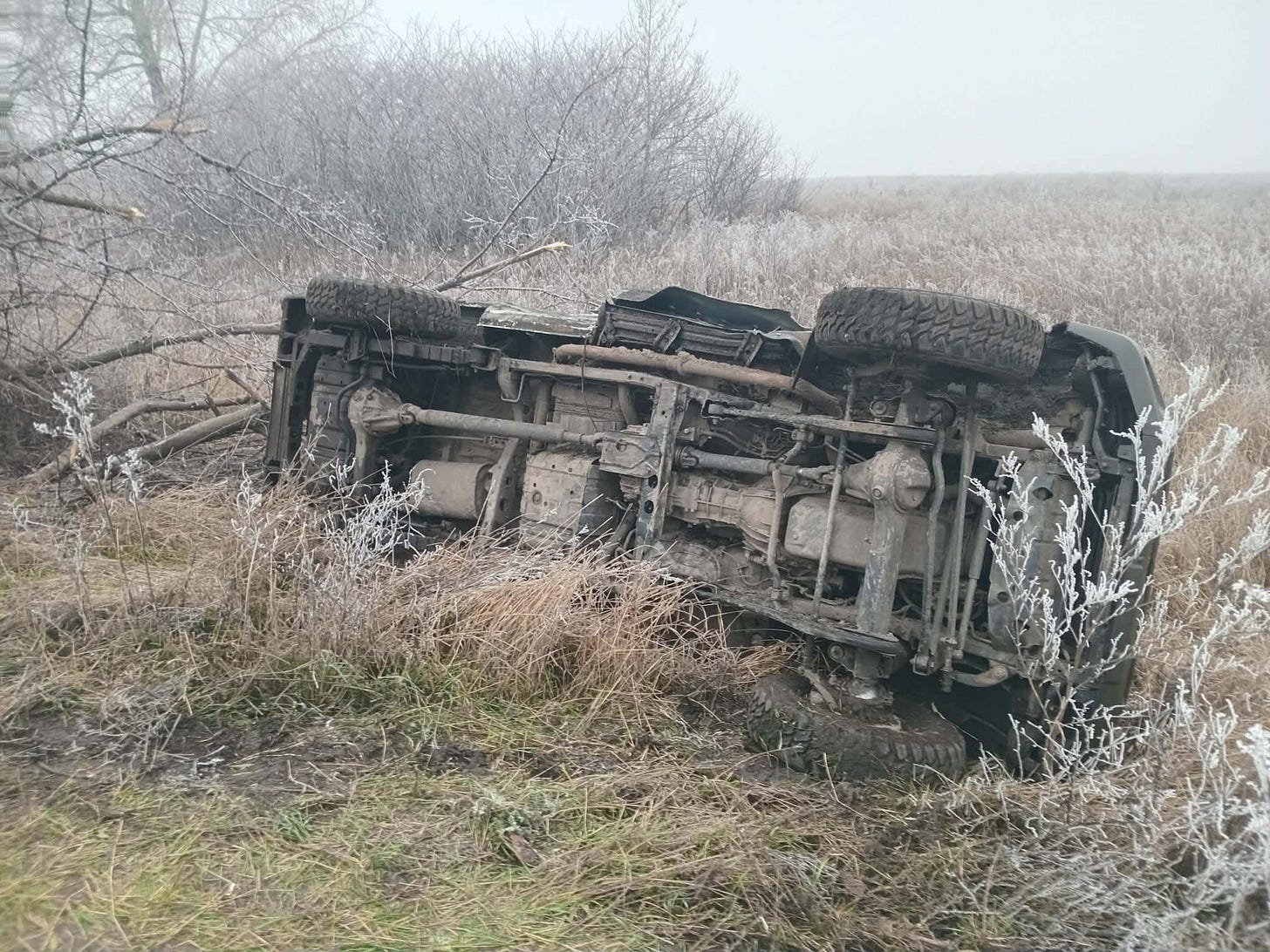 We’ve mostly been able to use the farm roads alongside the terrible county road thus far on the trip back. There’s a slick, icy layer of mud on top, but the ground underneath is firm now, probably still mostly frozen. It’s not deep mud at least. It's a little treacherous, but it’s traversable, and much smoother and faster than the ‘paved’ road is, but we’ll have what feels like a seemingly interminable stretch of that bad road ahead. We’ve all been down this horrible stretch of road too many times. The passage seems to take forever. Occasionally we will have to be on the paved road for a bit to get from one farmer’s road to the next accessible or usable one. Some of them still have big ponds at the entrances of them where you drop down off the tarmac road onto them. Big enough to daunt us even in my lifted Toyota with its big off-road tires, much less this stock one. We may have snorkels, but I worry the mud might be deep in the giant pond-like puddles, and I don’t like to subject vehicles to fording if I don’t have to, even ones with snorkels. Some of the farm roads that aren’t blocked by miniature lakes are in too rough of shape to even contemplate, between being a mass of rough ruts or apparently still waterlogged and appear to be deep mud. And then, as we near the end of the road to the Siversky Donets River, we are forced onto the terrible tarmac road again for another ten or fifteen minutes of bumping along slowly over endless potholes, often at less than twenty kilometers per hour.