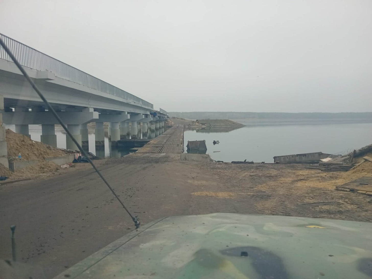 That pontoon bridge was hit a couple of weeks ago. Less than an hour after I drove over it on my way to the front. It was hit again while the engineers worked at reconstructing the pontoon bridge. Both of these were with the big KAB aerial glide bombs. The engineers then constructed a classic Bailey bridge over the gap in the uncompleted civilian bridge and then went back to work reconstructing the pontoon bridge again.
