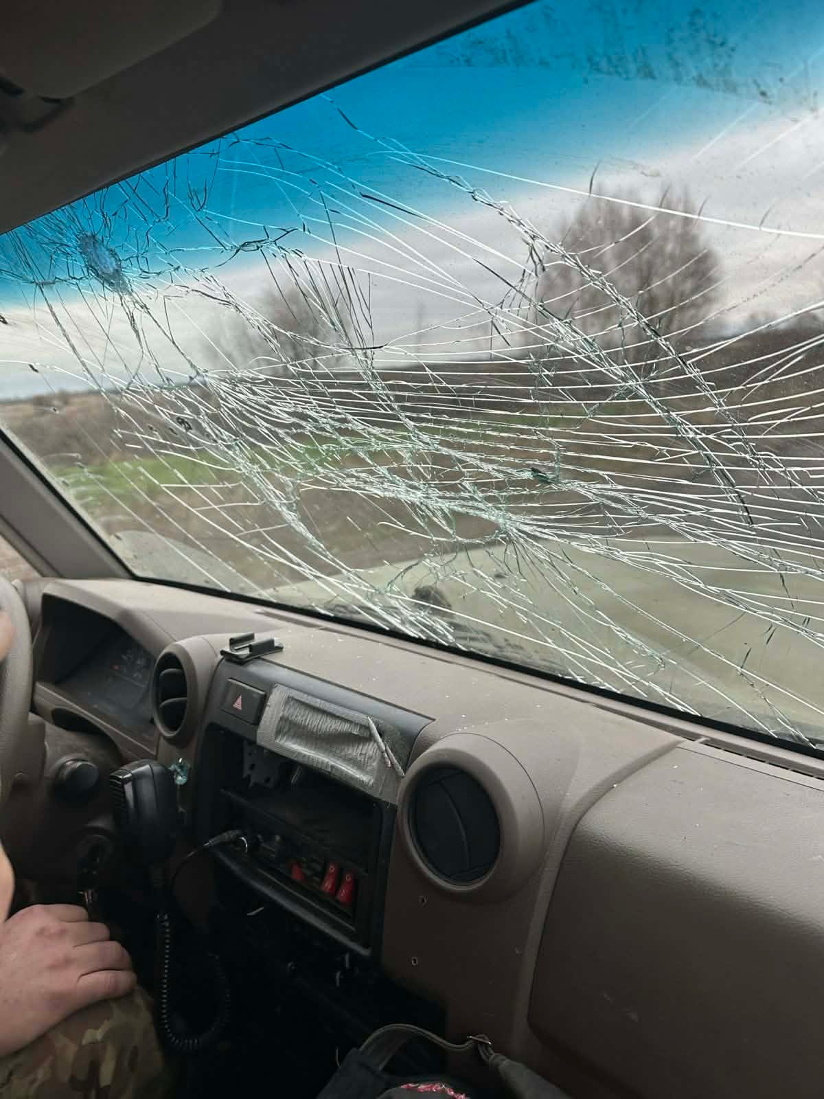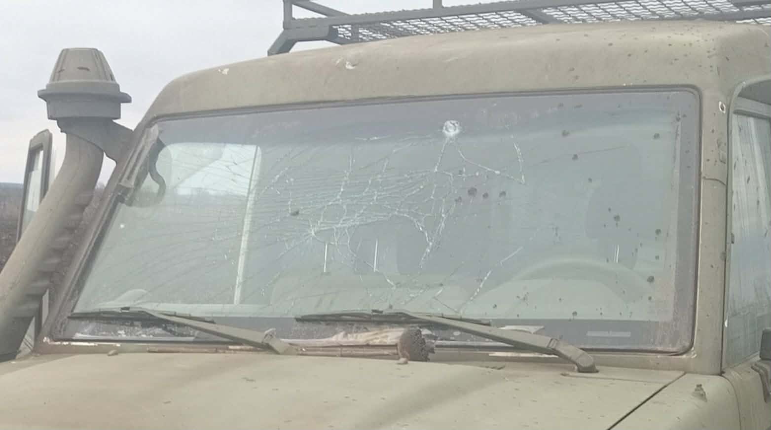 We were lucky that the drone had a comparatively weak warhead. At least two pieces of shrapnel struck the windshield, another piece of shrapnel punctured the clear plastic of one of the headlight housings but didn’t knock out the light or turn signal. Three pieces of shrapnel hit in the center front, two gouging the grille, the other impacting the radiator, but not penetrating it. Perhaps that one actually spent most of its energy gouging the grille. Two more pieces of shrapnel hit the edge of the roof, removing some paint and making minor dents there. All the starring on the windshield I think was just from the shock wave of the blast.