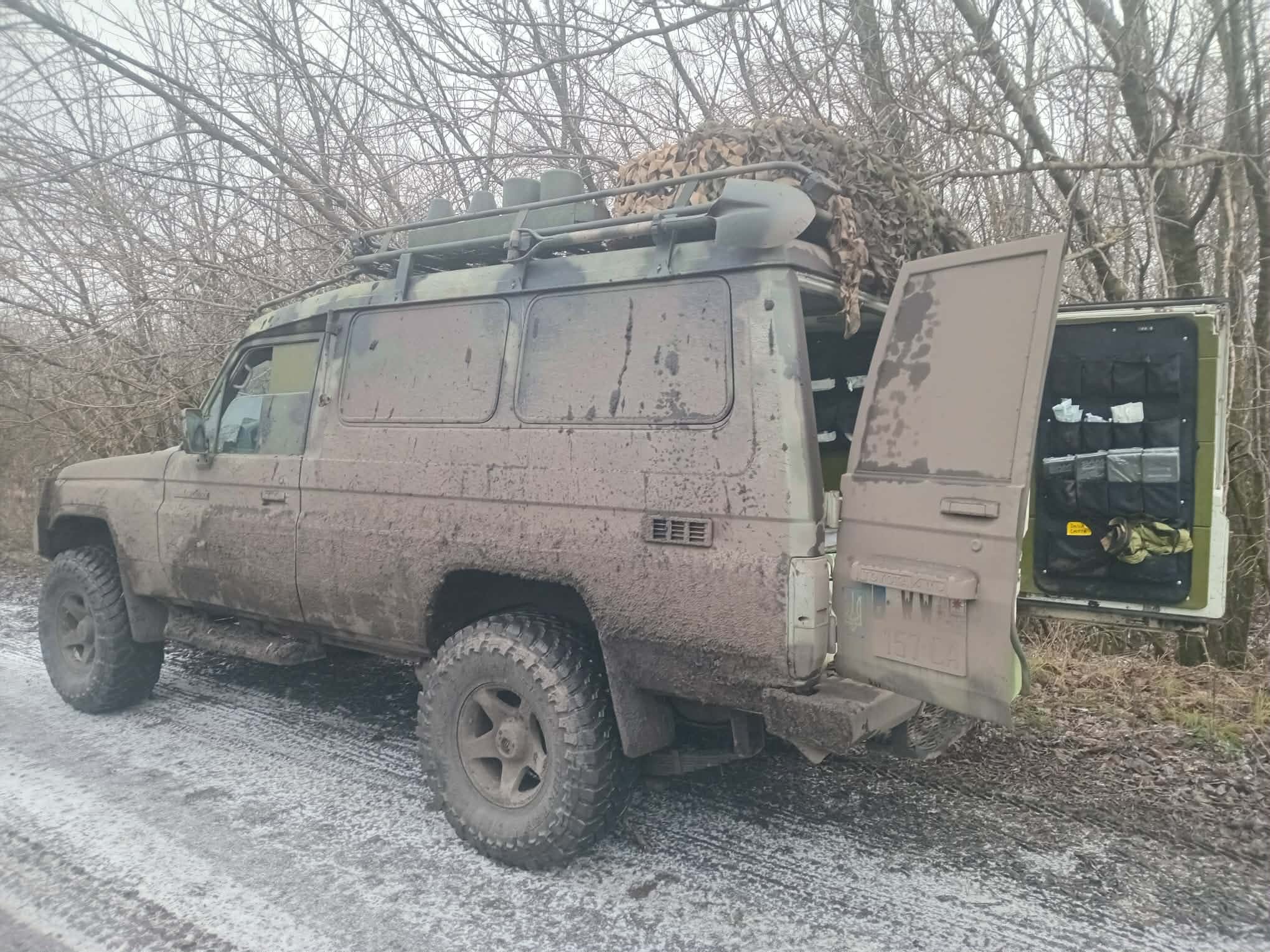 I have always wondered how the farmers feel about everyone using their land this way. Most farms have their own dirt road the rings their property for access, but over the course of the year, that road gets deeply rutted as people continue to use it when it starts getting badly muddy. Then, others will drive around the farmers’ road, alongside it, beating a new dirt road into the farmers’ ploughed field. My spell correct wants to convert my American English (plow, plowed) into UK standard. I am going to let that one stand. Over the course of a year, a farmer might lose a significant chunk of his land to these roads that people are carving through his property, as five or more are made, then abandoned as they each get too muddy (deep), or the frozen ruts in them make them nearly unusable. We got a hint of how they might feel about his when over the past week a farmer came through and reploughed his land, erasing all but the original farm road, and leaving rough, frozen, chunky earth, resistant to forging a new trail in it. For whatever it is worth, it isn’t just the army driving on his land, delivery vehicles and the locals eschew their battered road too, those that haven’t fled this dangerous area, with the Russians slowly creeping closer again. This area was liberated in the counter-offensive around Kharkiv in late 2022, but folks living here already spent six months under Russian occupation. Although quite a few people remain, some fled, in some cases evidenced by their unharvested fields. The benzene Toyota has a few stowaways in the form of sunflower heads trapped in the empty foglight housings from traversing some of these unharvested fields: