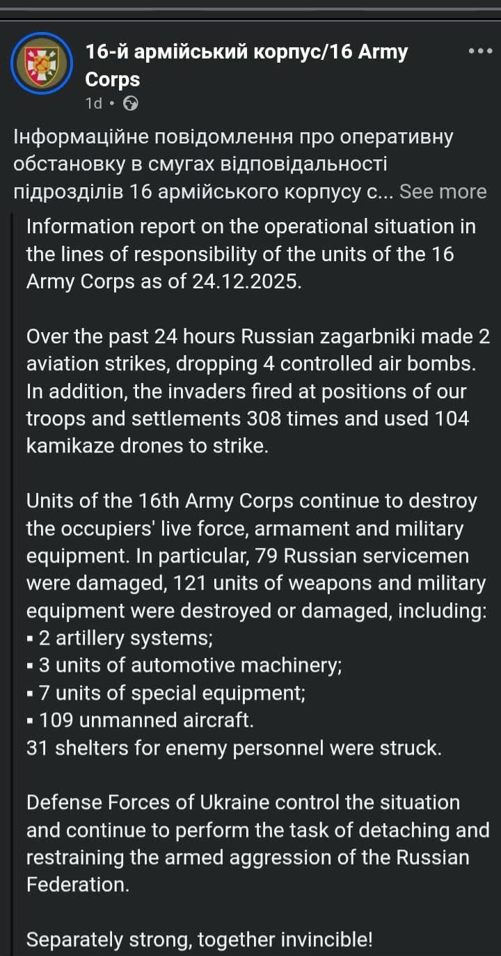Yesterday was a record setting day in the amount of drones Ukraine shot down. This is because Russians are celebrating Christmas by attacking Ukraine with very large amounts of drones and rockets, as well as pushing hard on the frontlines. Many of the days over the past two weeks they lost well over a thousand men either badly wounded or killed and they actually scrounged up some tanks and armored personnel carriers to get blown up trying to crack our lines. The drone that attacked me isn’t counted in the numbers of drones shot down there of course, it impacted the ground right in front of us, and although the only wounded weren’t soldiers, or even humans, it did damage a military vehicle, albeit only lightly. Still, when I saw that statistic this morning of drones shot down, I couldn’t help but think of myself being counted in the negative space of that infographic for the war yesterday, the drones that got through.